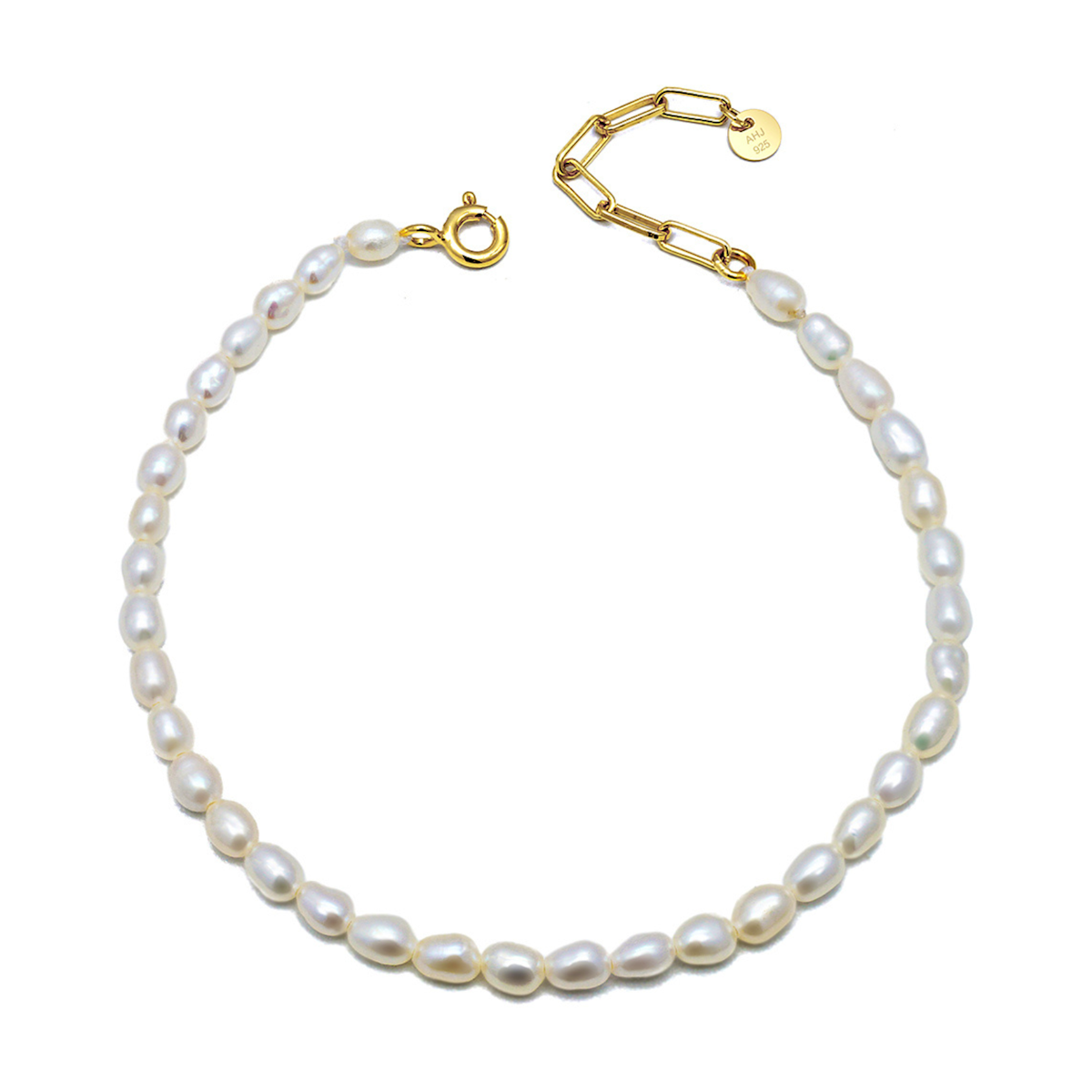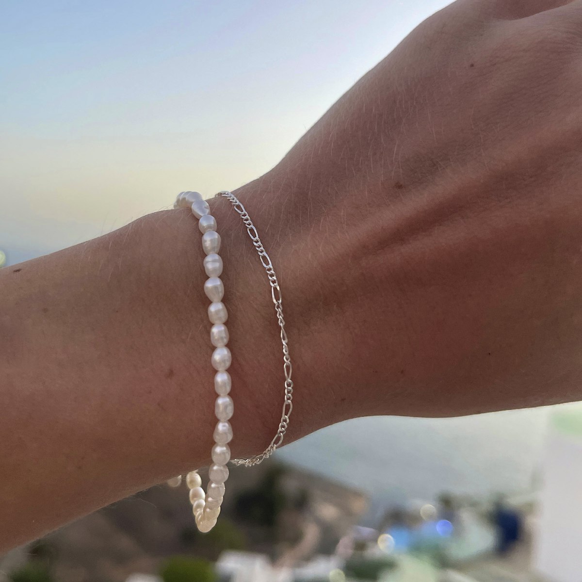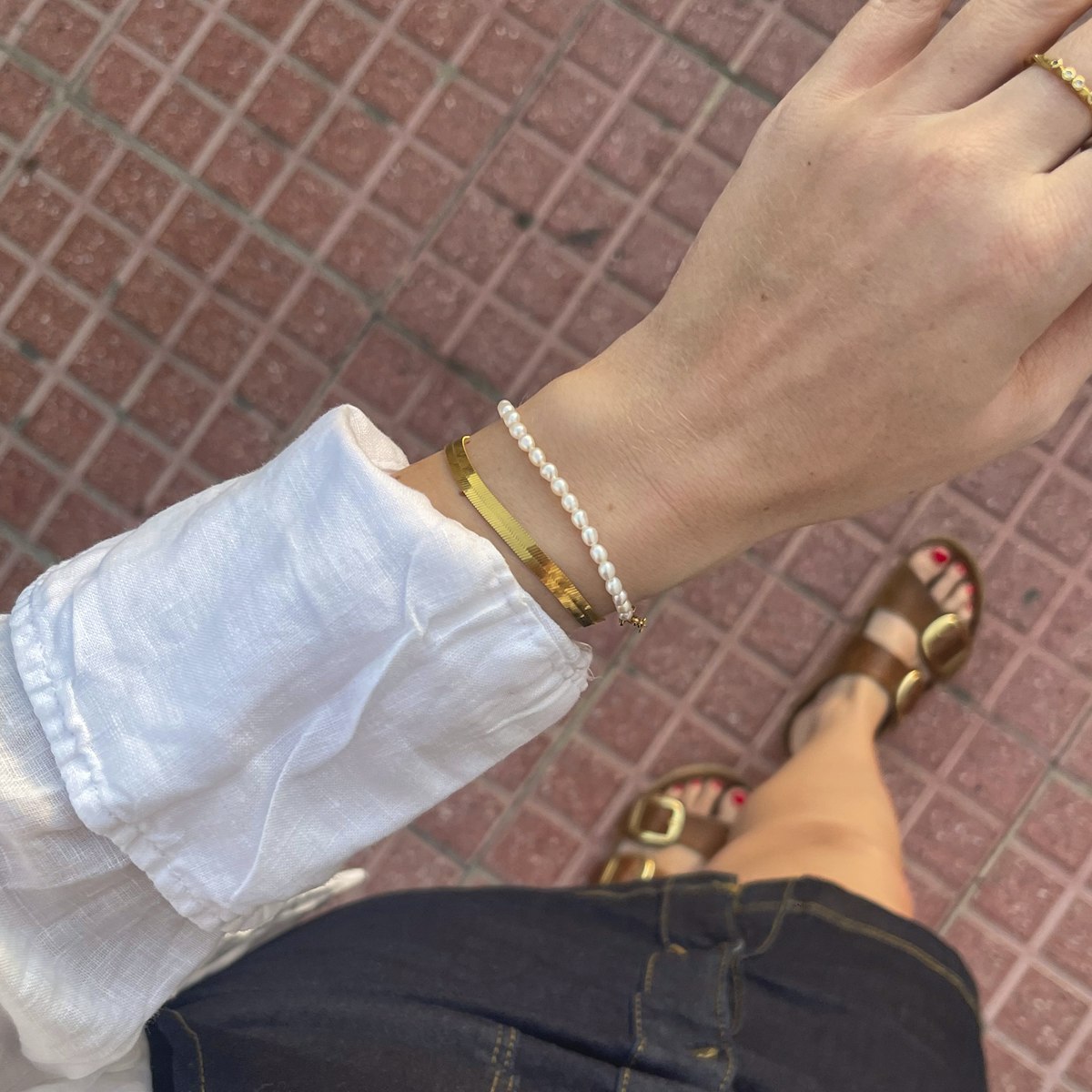 Armbåndet er prydet med glatte, luksuriøse perler, der skaber et subtilt og sofistikeret udseende. Armbåndets lukning er tilgængelig i både 24 karat forgyldning og sølv, hvilket skaber et flot finish. Dette giver dig mulighed for at tilpasse armbåndet efter din personlige smag og præference.