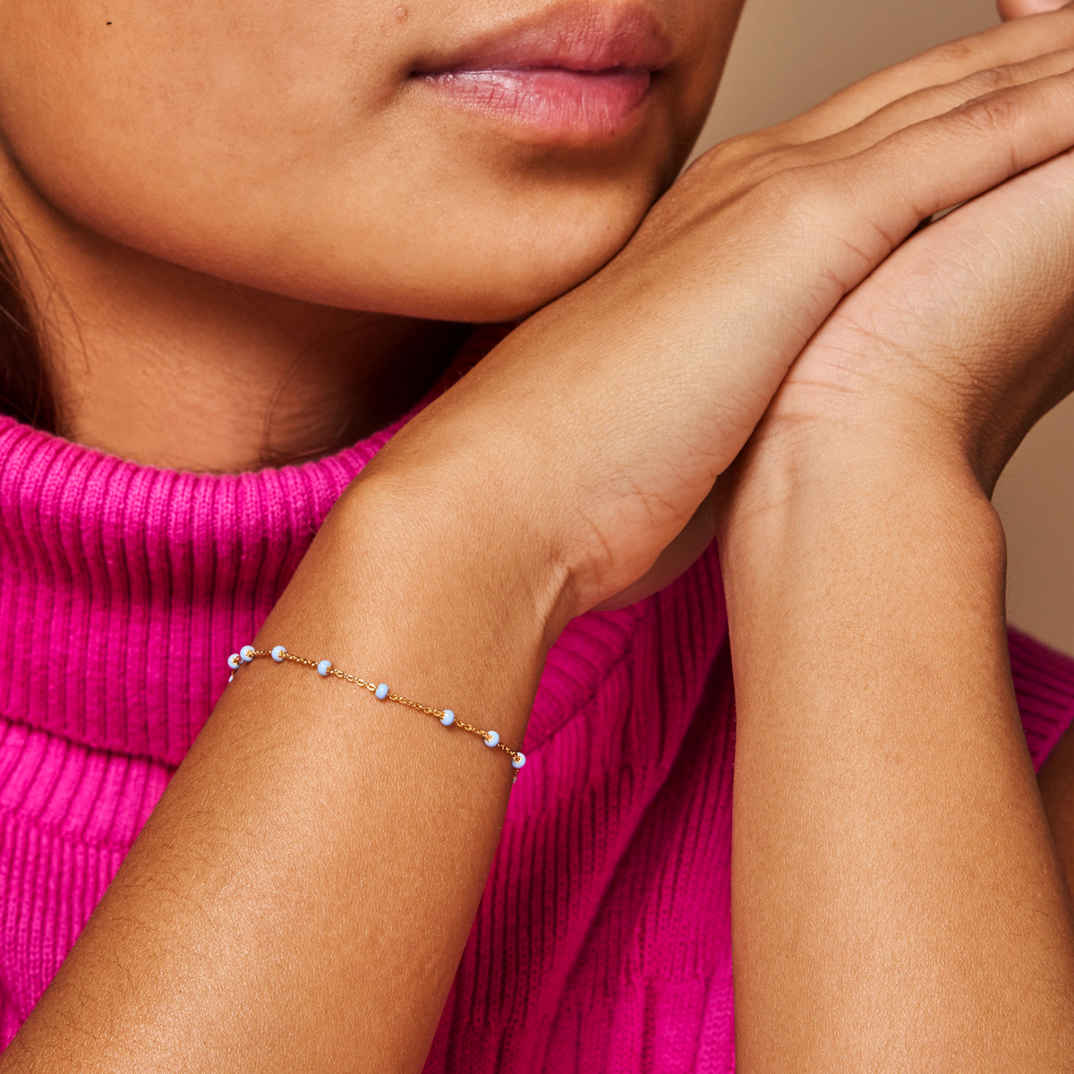 Lola Bold armbåndet fra ENAMEL Copenhagen er det perfekte valg, hvis du elsker smykker, der skiller sig ud med farve og personlighed. De håndmalede emaljekugler, som kendetegner designet, er større end på det klassiske Lola armbånd og giver derfor et mere markant og fyldigt udtryk. Det livlige miks af farver skaber et cool og finurligt look, som både kan bæres alene eller kombineres med andre favoritter. Armbåndet fås i flere smukke farvekombinationer, så du nemt kan finde din egen personlige favorit. Husk dog at passe godt på emaljekuglerne og undgå brusebad, parfume og cremer, så armbåndet bevarer sin skønne farve og struktur.