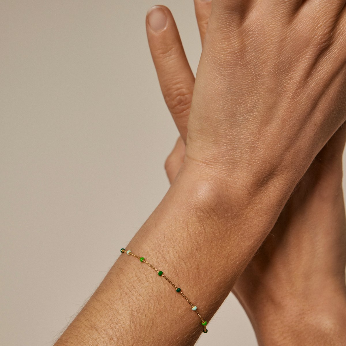 Lola armbåndet er et smukt valg for dem, der ønsker at tilføje en touch af farve til deres look. Det er et kæde-armbånd med små, farvede emaljebånd, der skaber en nydelig og unik effekt. Armbåndet kan bæres alene for at fremhæve det fine design eller kombineres med andre armbånd for at skabe en personlig og kreativ stil. Vores udvalg af Lola armbånd er bredt og inkluderer flere farver, så der er noget for enhver smag. Men vær opmærksom på at bære ikke Lola style i bad, mens du sover og for tæt på parfumer og cremer, da emaljen kan ændre farve og struktur.
