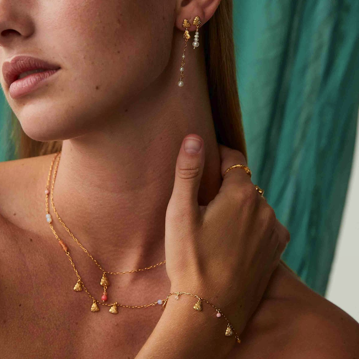 Coralie er inspireret af naturens skønhed. Formet som klippe sten, med flotte koralfarvede perler. 18K forgyldt sterlingsølv med 1 mikron og e-coating. Længde: 16 + 3 cm flex.