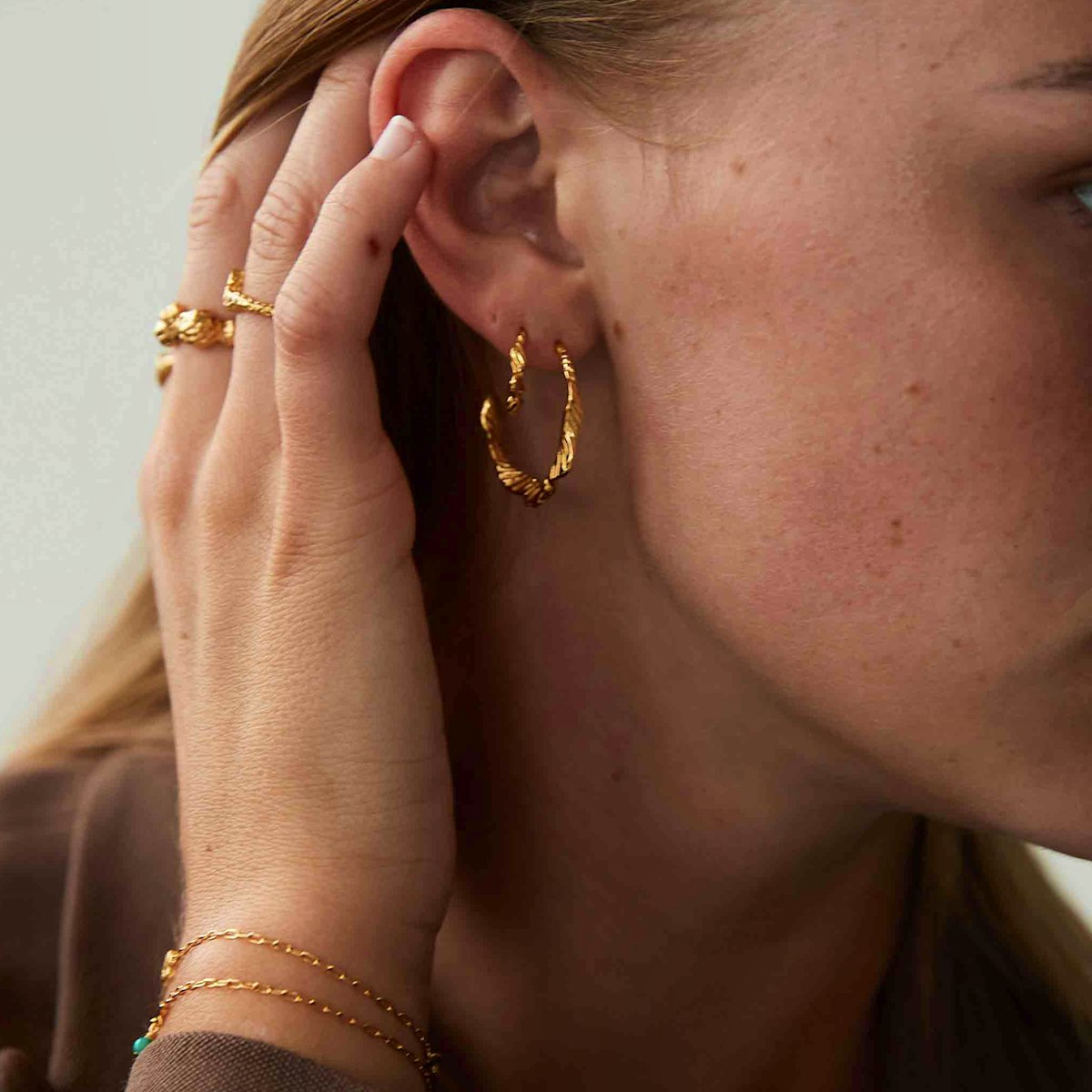 Lorelei er en snoet hoop, som kan anvendes til hverdags brug, men også festlige begivenheder. 18K forgyldt sterlingsølv med 1 mikron og e-coating. Diameter: 1.5 cm