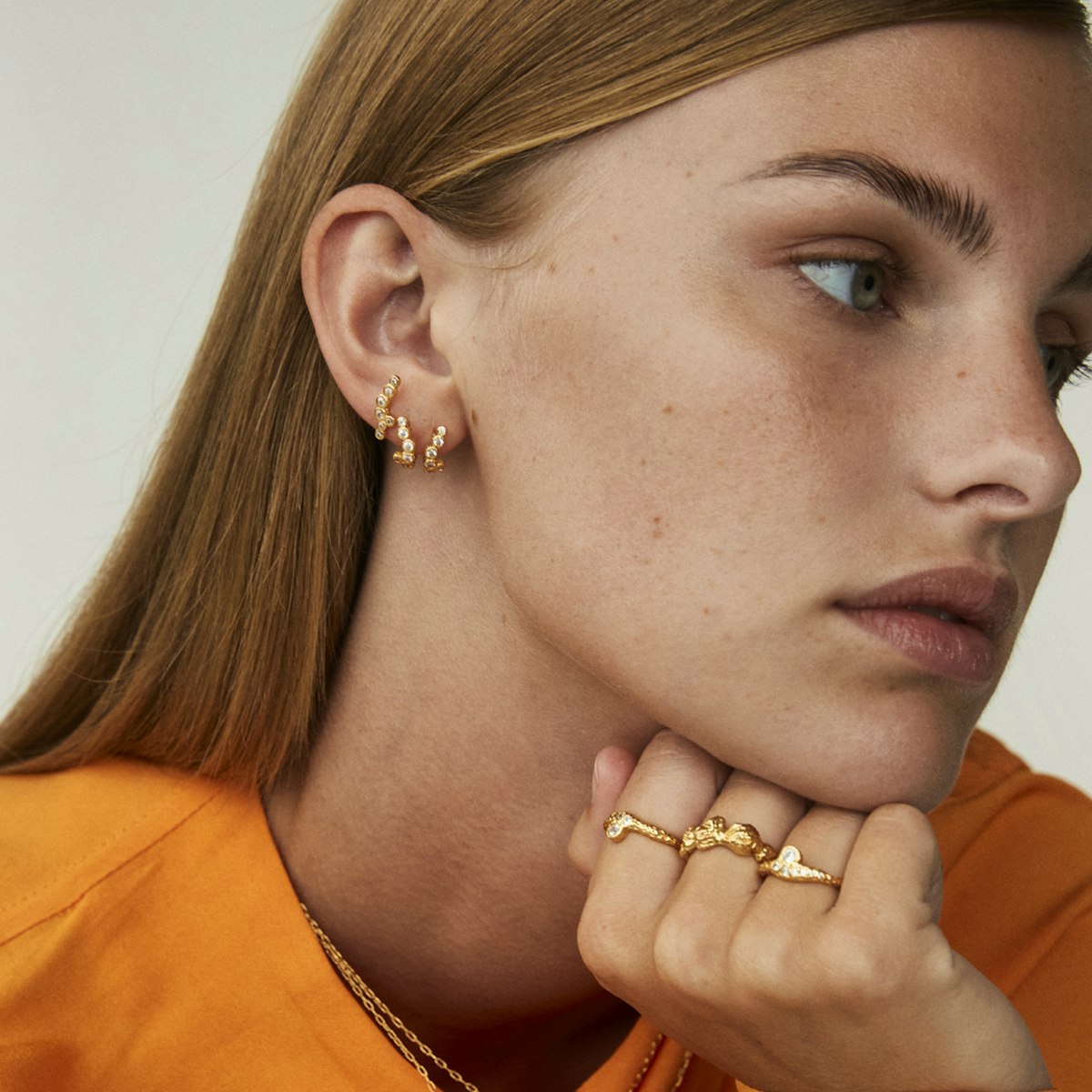 Vivienne hoops tilføjer et touch af elegance til ethvert look. Deres delikate design snor sig nænsomt op ad øreflippen, som skaber en smigrende kurve og dækker ørepiercingen på en diskret måde. Den 18K forgyldte sterlingsølv konstruktion sikrer både holdbarhed og et sofistikeret udseende, der passer til enhver lejlighed. Disse hoops er ikke kun et smykke, men en erklæring om stil og klasse. Deres alsidighed gør dem til en uundværlig del af enhver smykkesamling, der let kan styles med alt fra en enkel T-shirt og jeans til en formel aften kjole. Diameter: 1,1 cm.