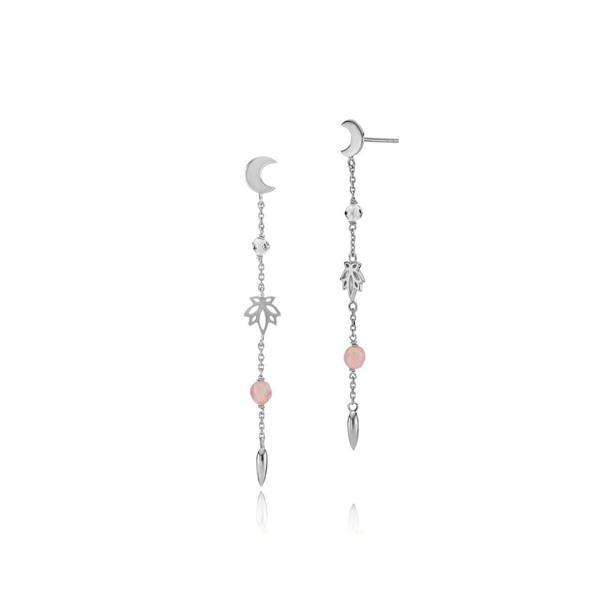 Øreringene er designet med måner, krystaller, lotusblomster og rosekvarts.