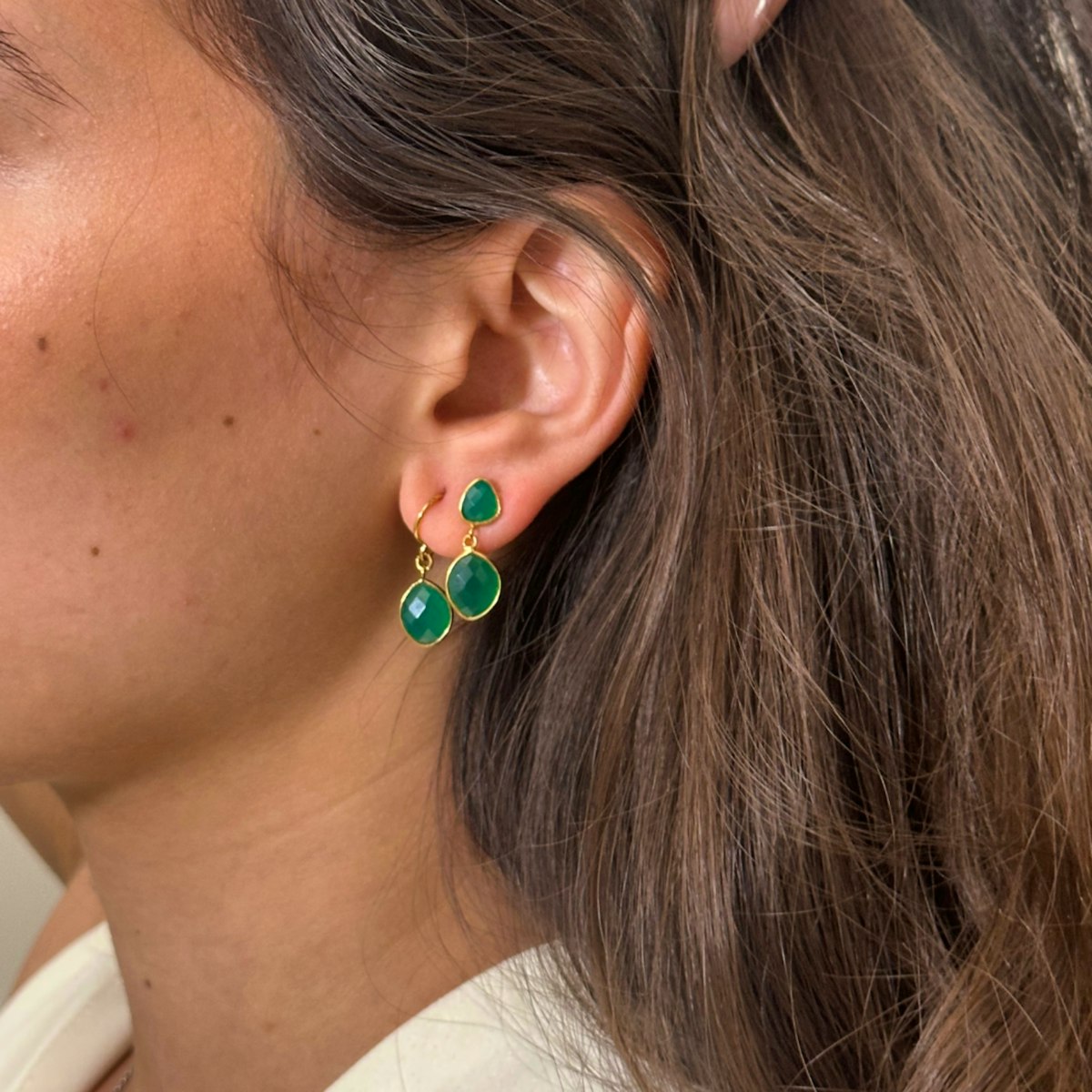 Grüner Onyx ist bekannt für seine tiefe, lebendige Farbe und seinen ruhigen, harmonischen Ausdruck. Der Stein ist so geschliffen, dass er das Licht schön einfängt und den Ohrringen ein subtiles, aber auffälliges Spiel verleiht. Er ist elegant, ohne aufdringlich zu sein, und macht den Schmuck sowohl für den Alltag als auch für festliche Anlässe ideal.