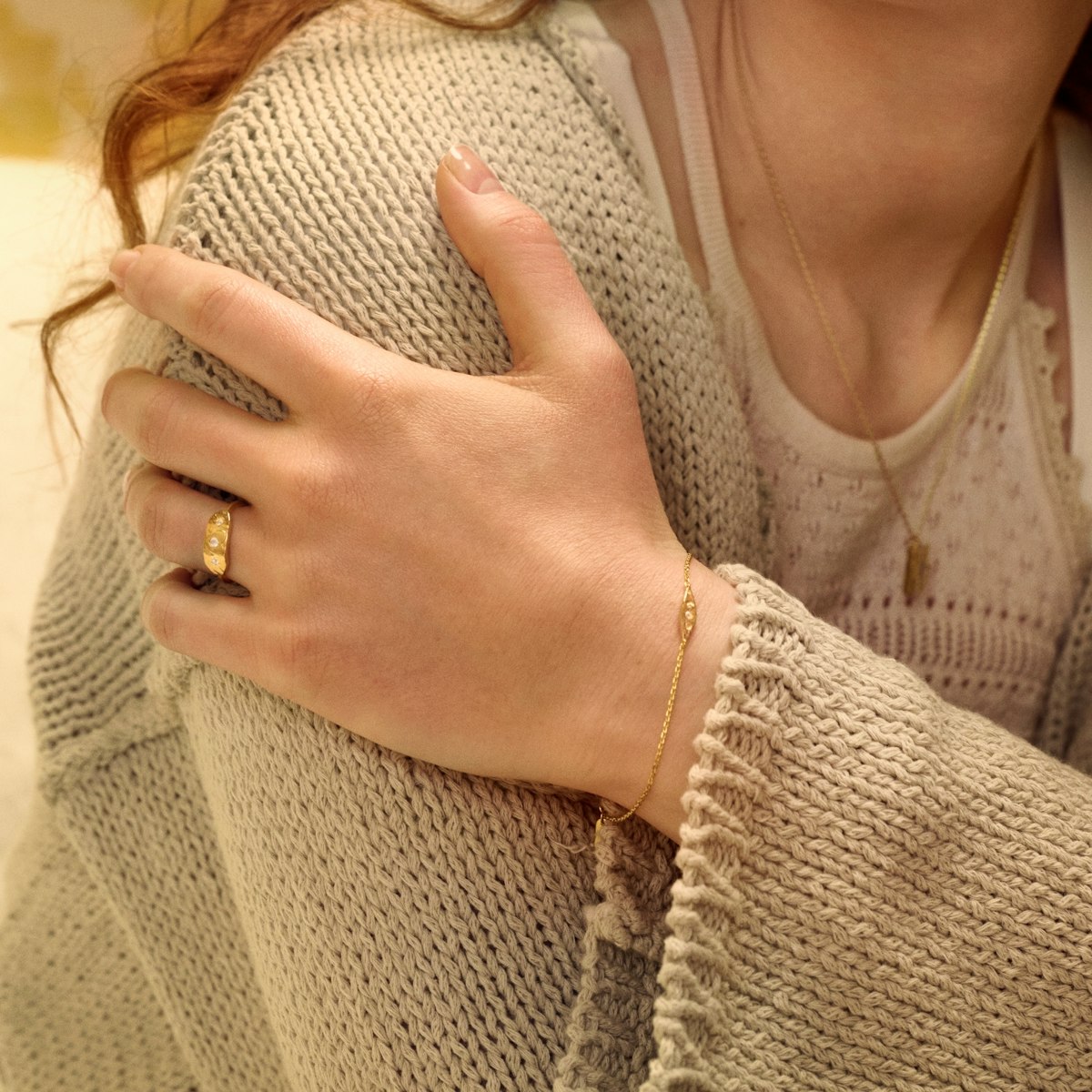 Soma armbåndet indebærer et betagende design med fortryllende detaljer. Armbåndet prydes af en lille, gylden plade, som fungerer som midtpunkt i designet. Denne plade er omhyggeligt indgraveret med et smukt mønster af halvmåner, der tilfører en fin symbolik af nattehimlen og dens cykler. Halvmånerne er indgraveret med en præcision, der fremhæver deres elegante kurver og giver en følelse af dybde og kompleksitet til armbåndets design.