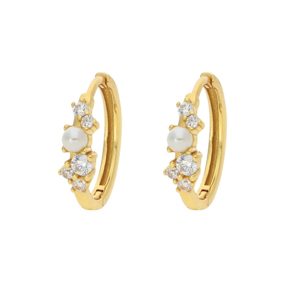 Das Herzstück des Schmucks sind die wunderschönen Süßwasserperlen, die dem Design eine organische und raffinierte Note verleihen. Um die Perlen herum befinden sich kleine, klare Zirkoniasteine, die das Licht einfangen und einen eleganten und funkelnden Look erzeugen. Die Kombination aus den glänzenden Steinen und dem weichen Schimmer der Perlen schafft ein raffiniertes Gleichgewicht, das die moderne Frau mit einem Auge für Details anspricht.