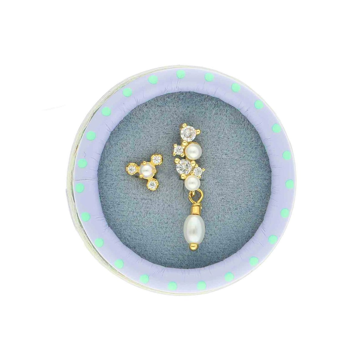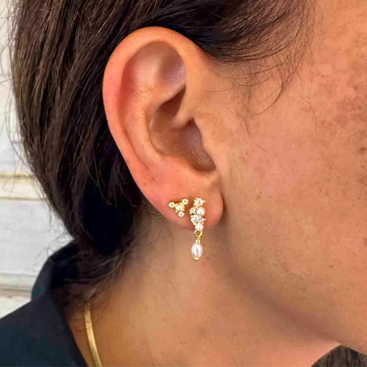 Die Ohrringe sind aus 18 Karat vergoldetem, recyceltem 925er Sterling-Silber gefertigt, was ihnen einen warmen und strahlenden Glanz verleiht, der jedem steht. Und wenn sie aus recyceltem Silber hergestellt sind, bekommst du nicht nur ein super hochwertiges Schmuckstück, sondern auch eine nachhaltigere Wahl - das ist smart! Jeder Ohrring ist mit einem erstaunlichen Materialmix geschmückt: Feine, echte Süßwasserperlen sorgen für einen organischen und klassischen Look, während glänzende Muschelperlen für ein glattes, perfektes Finish sorgen. Abgerundet wird das Ganze durch funkelnde Zirkoniasteine, die so platziert sind, dass sie das Licht einfangen und dezent, aber dennoch auffällig funkeln.