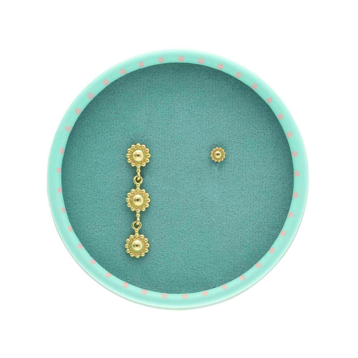 Die Flower Box Earrings sind ein wunderschönes und charmantes Schmuckkästchen voller kleiner Details, die auf den ersten Blick begeistern. Hier erhalten Sie ein Ohrring-Set aus 24 Karat vergoldetem Sterlingsilber, das mit einem Sinn für Eleganz und Persönlichkeit entworfen wurde. Ein Ohrring besteht aus drei kleinen Blumenanhängern, die leicht herabhängen und sich bei jedem Ihrer Schritte anmutig bewegen. Der andere ist ein einzelner Ohrstecker in Form einer zarten Blume, der dicht am Ohr sitzt. Zusammen ergeben sie einen verspielten und stilvollen Look, perfekt für alle, die gerne kombinieren.