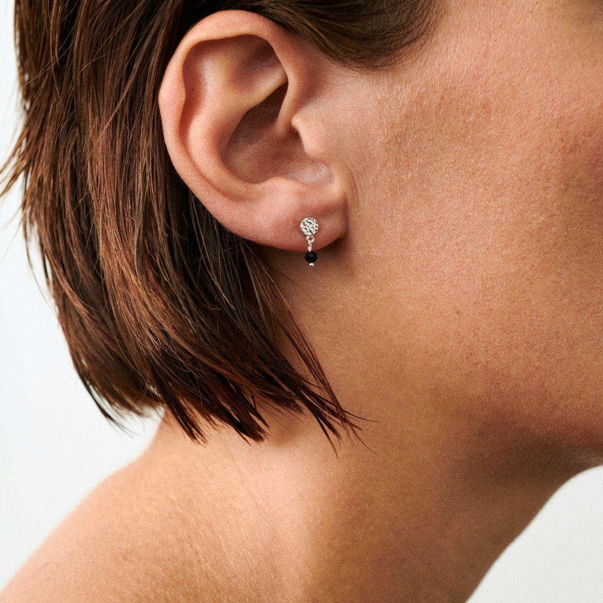Die Black Nature Earsticks sind von der Natur inspirierte Ohrstecker, die die organischen Muster und lebendigen Texturen des Herbstes wunderschön einfangen. Die runden Ohrstecker haben eine gebürstete und strukturierte Oberfläche für einen rauen und doch eleganten Look. Unter jedem Ohrstecker schwebt ein kleiner schwarzer Onyxstein von 2 bis 3 mm Größe, wenn Sie Ihren Kopf drehen. Der Kontrast zwischen dem strukturierten Silber und dem tiefen, dunklen Stein schafft ein harmonisches Zusammenspiel, bei dem das Licht die Oberfläche auffängt und kleine Reflexionen erzeugt, die den Schmuck lebendig und einzigartig machen. Die runde Form von 4 mm macht die Ohrstecker dezent und doch auffällig genug, um Ihrem Outfit einen künstlerischen Touch zu verleihen.