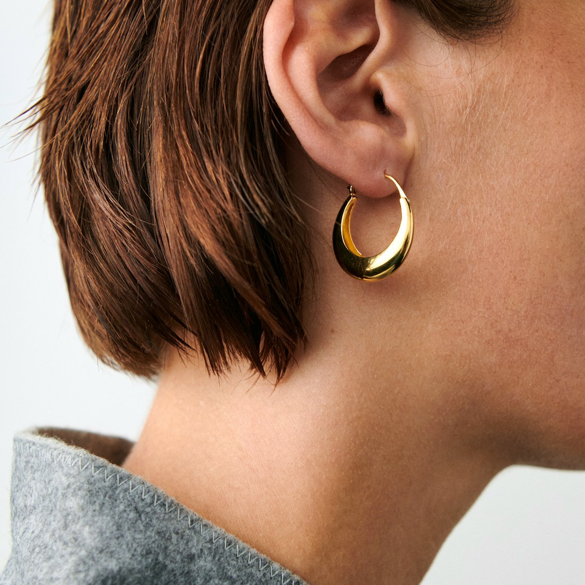 Diese Ohrringe sind perfekt für alle, die einen minimalistischen, klassischen und modernen Look lieben. Sie verleihen jedem Outfit einen zeitlosen Touch und lassen sich leicht mit anderem Schmuck kombinieren, um einen persönlichen, ausgewogenen Stil zu kreieren. Die großen Atlas-Ohrringe sind sowohl in versilberter als auch in 18-karätiger vergoldeter Ausführung erhältlich. Beide sind mit einem Kern aus 100 % recyceltem Messing überzogen, was sowohl Qualität als auch einen verantwortungsvolleren Produktionsprozess gewährleistet.