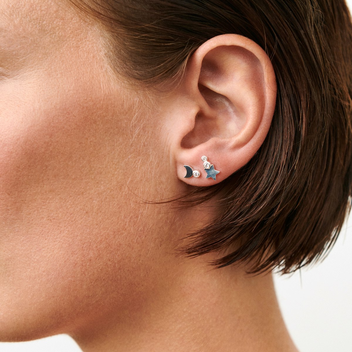 Twinkle Earsticks sind funkelnde Ohrstecker, die den Zauber eines klaren Nachthimmels einfangen. Das Set besteht aus zwei verschiedenen Motiven - einer zarten 5 mm großen Mondsichel und einem eleganten 6 mm großen Stern - beide mit einer natürlich gebürsteten Oberfläche, die ein weiches und halbmattes Lichtspiel erzeugt. Der Mond ist mit einem schönen weißen Zirkoniastein besetzt, während der Stern mit zwei kleinen funkelnden Steinen verziert ist, die zusammen einen lebendigen und strahlenden Look ergeben. Die beiden Formen ergänzen sich gegenseitig und sorgen für einen femininen, märchenhaften Look, egal ob Sie einen in jedem Ohr oder beide zusammen in einem Ohr tragen.