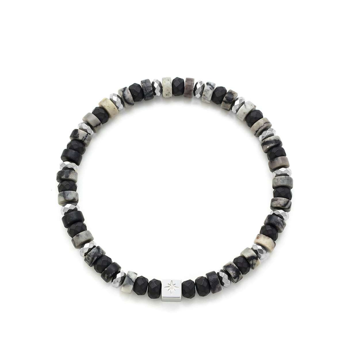 Armbåndet er fremstillet med elastisk snor, og designet med et udvalg af små black stone perler og hæmatit sten samt stål detaljer i forskellige størrelser og faconer. Midt på armbåndet er der en lille stål detalje, hvor der er ingraveret et "S" på den ene side og et stjerne symbol på den modsatte.