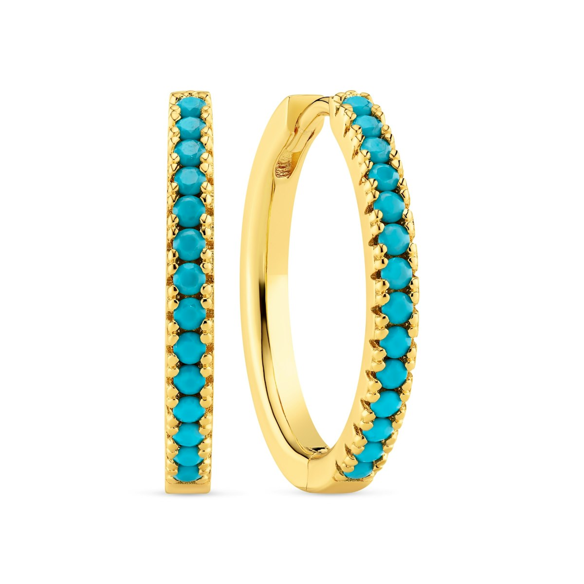 Die Sif Jakobs Grande Turquoise Earrings sind ein elegantes und auffälliges Paar Ohrringe, das klassisches skandinavisches Design mit einem Hauch von farbigem Luxus verbindet. Die Ohrringe sind aus 18 Karat vergoldetem 925er Sterlingsilber und 925er Sterlingsilber mit einer polierten Oberfläche für einen schönen Glanz gefertigt. Die saubere goldene Basis hebt die facettierten Türkissteine hervor, die dicht an dicht in die Vorderseite jedes Reifs gefasst sind. Die Steine sorgen für einen frischen und exklusiven Farbkontrast, der das Licht bei jeder Bewegung schön einfängt. Mit einem Durchmesser von 14 mm, einer Breite von 2 mm und einer Dicke von 2 mm eignen sich die Grande Turquoise Earrings sowohl für den Alltag als auch für besondere Anlässe.