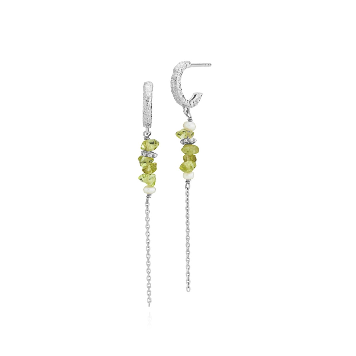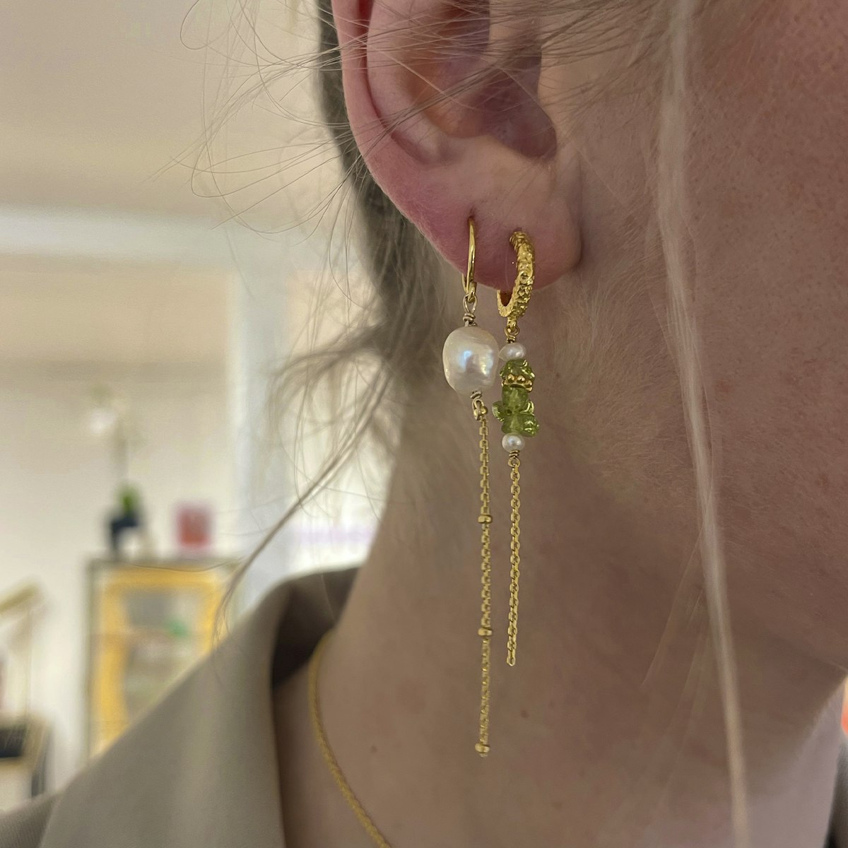 Strandøreringe Øreringene er lavet af 18 karat guldbelagt genanvendt sølv eller sølv med hvide/cremefarvede glasperler og grøn peridotsten. Designet er en halv krydsning med en lås bag øret, og en løs kæde med perler og sten nedenunder. Beach-kollektionen består af flere forskellige lange øreringe i et strandtema med grønne, blå og hvide perler og sten samt søstjerner og muslinger.