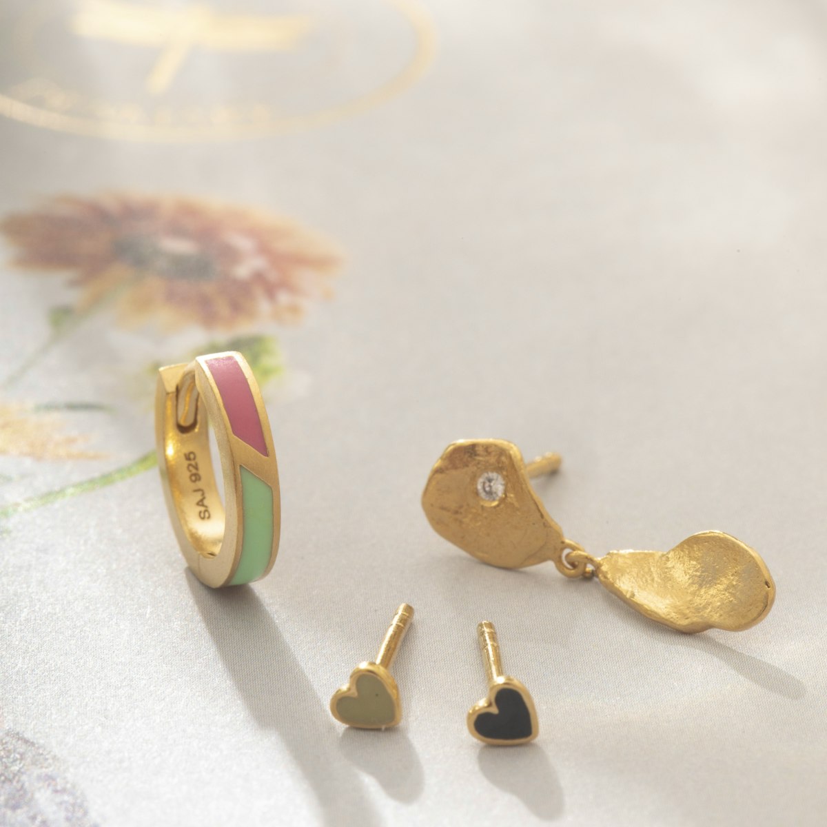 Sød lille hjerteørestik med oliven grøn emalje i hjertet.