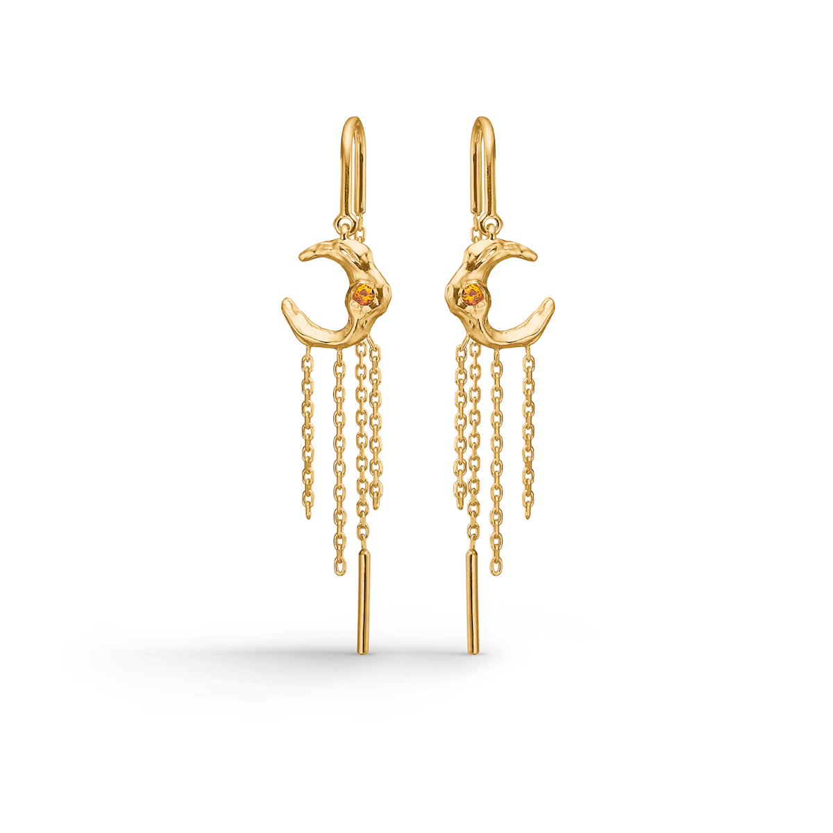 Die Lunar-Ohrringe von Studio.Z sind eine elegante Interpretation des Geheimnisses und der Schönheit des Mondes. Die 30 mm langen Ohrringe haben eine bezaubernde Halbmondform, die mit funkelnden orangefarbenen Zirkonia verziert ist, die wie Sterne am Nachthimmel glitzern. Das wunderbare Design schafft ein Gleichgewicht zwischen Ätherischem und Modernem - perfekt für alle, die mit ihrem Schmuck Persönlichkeit und Poesie ausdrücken möchten. Lunar ist mit einer schönen, haltbaren 18-karätigen Goldplattierung erhältlich, so dass Sie den Look wählen können, der zu Ihrem Stil und Ihrer Stimmung passt.